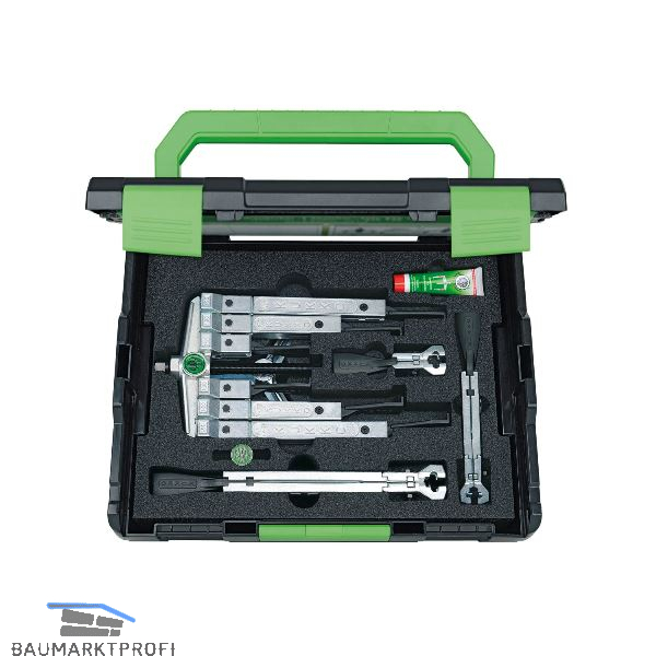 2- und 3- armiger Abzieher-Satz "8 in 1". Mechanische Abzieher mit schlanken S-Abzughaken in mehreren Längen für enge Zwischenräume und zusätzlich langer Spindel. Die Zweiarmigkeit ermöglicht platzsparendes Arbeiten. Die Dreiarmigkeit garantiert gleichmäßige Lastenverteilung und dadurch besonders sicheren Halt am abzuziehenden Teil. Auf der Traverse stufenlos verschiebbare Abzughaken. Die Traversen besitzen ein Sechskantprofil an dem bei Bedarf ein Schlüssel zum Gegenhalten angesetzt werden kann. Universell einsetzbar, zum Abziehen von Getriebezahnrädern, Lagern, Ritzeln und Synchronkörpern. Durch Umdrehen der Abzughaken als Außen- und Innenabzieher verwendbar. Auch zum Abziehen asymmetrischer Werkstücke geeignet. Lieferung in L-BOXX.