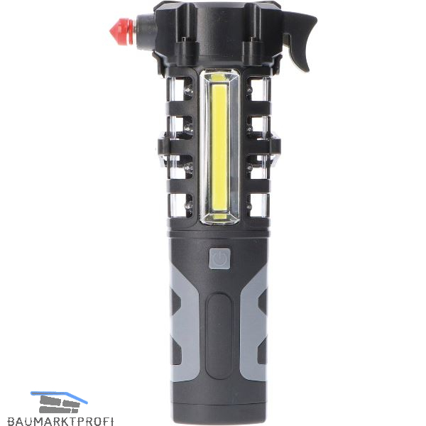 Praktisches Multitool mit starker Taschenlampe, kräftiger Arbeitsleuchte und einem orangefarbenen blinkenden Signallicht für Ausnahmesituationen. Rettungshammer zum Einschlagen von Scheiben in Notfällen. Gurtschneider zum Durchtrennen von Sicherheitsgurten. Starker Magnet zur Haftung an magnetischen Oberflächen. Inklusive Wandhalterung zum Kleben oder Anschrauben.