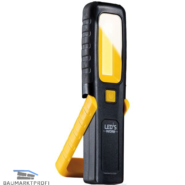 Arbeitsleuchte mit 360º drehbarem Haken und Taschenlampenfunktion. Magnetfuß für sicheren Halt. Der Fuß kann stufenlos verstellt werden. Lichtquelle COB auf der Vorderseite und LED auf der Stirnseite mit zwei Helligkeitsstufen (100% oder 50%). Griff aus ABS-Material mit Gummiapplikationen.