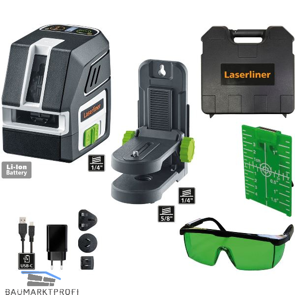Lieferung inkl. Wandhalterung PocketWallHolder, Magnet-Zielplatte grün, Lasersichtbrille, Li-Ion Akku, Netz-/Ladegerät inkl. internationalen Adapter, USB-C Kabel, im Tragekoffer.