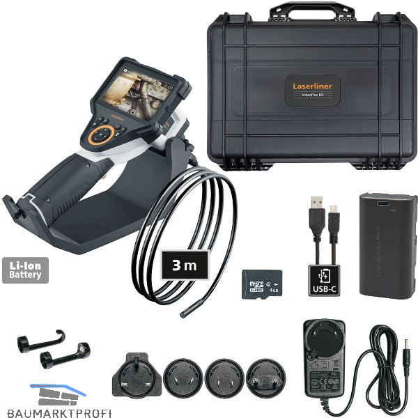 Das professionelle Videoinspektionssystem mit wechselbarer Front- und Seitenansicht ist ideal für genaue visuelle Kontrollen in Rohrleitungen, Wandhohlräumen und Kraftfahrzeugen. Die hochauflösende Kamera ermöglicht sehr detailreiche Bild- und Videoaufnahmen mit 1:1-Wiedergabe auf dem Display ohne Qualitätsverlust. Durch den klaren digitalen Zoom lassen sich Details hervorragend erfassen. Weitere Vorteile sind die erstklassige LED-Objektbeleuchtung, optimale Kontrastwiedergabe von Grauabstufungen und der magnetische Ständer. Am benzin- und dieselresistenten Kamerakopf können die Magnet- und Hakenaufsätze zum Anziehen oder Anheben von schwer erreichbaren Gegenständen angebracht werden.