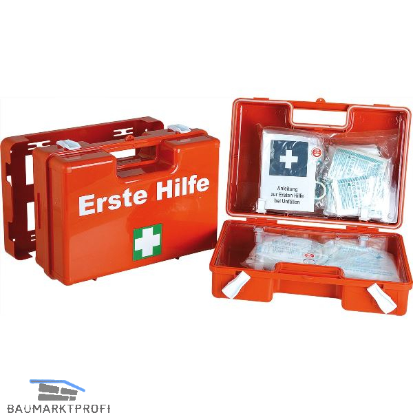 Erste-Hilfe-Koffer nach DIN 13157 - ABS-Kunststoff, schlagfest und bruchsicher, mit Gummidichtung und Wandhalterung. Transparente Abdeckplatten zum Schutz der Füllteile, variable Inneneinteilung durch Trennstege, plombierbar.