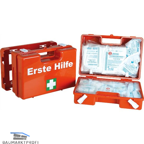 Erste-Hilfe-Koffer nach DIN 13169 - ABS-Kunststoff, schlagfest und bruchsicher, mit Gummidichtung und Wandhalterung.Transparente Abdeckplatten zum Schutz der Füllteile, variable Inneneinteilung durch Trennstege, plombierbar.