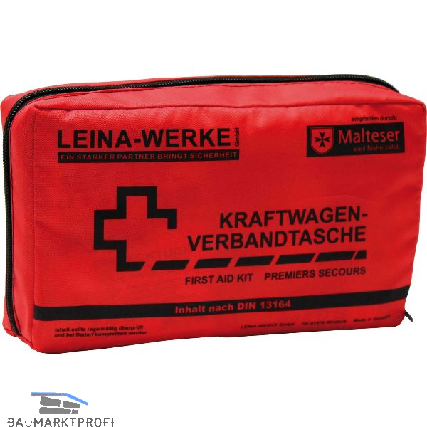 Inhalt nach DIN 13164, welche die Anforderung an Erste-Hilfe-Ausstattung für mehrspurige KFZ festlegt. Aus wasserabweisendem Nylongewebe mit Reißverschluss genäht. Ohne Klett.