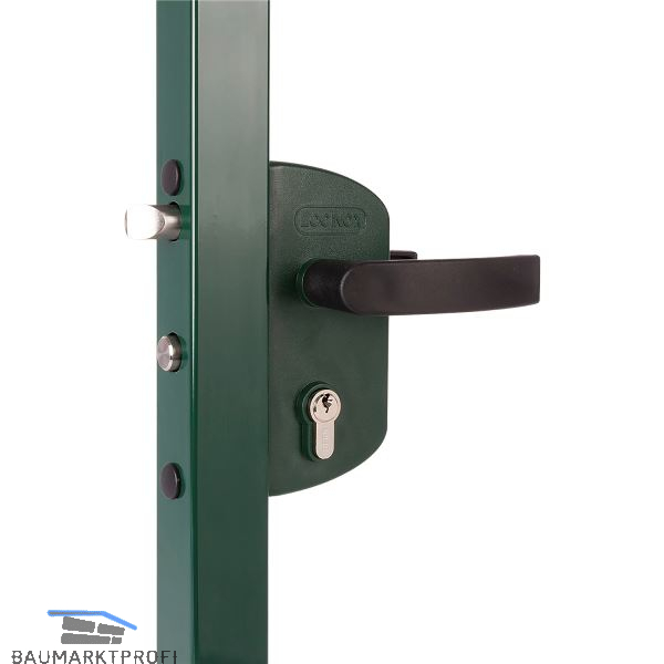 Gartentorschloss mit Polyamid-Gehäuse und Edelstahl- Mechanismus. Ein massiver Edelstahl- Schlossriegel mit einer 23 mm Tiefenverriegelung garantiert eine sichere Schließung. Für eine schnelle und höchst präzise Montage empfehlen wir die Bohrschablone Drill-Fix.