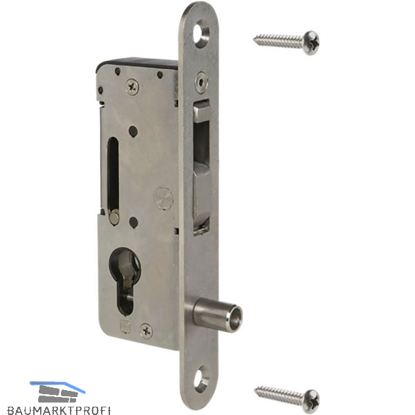 Einsteckschloss mit 100% Edelstahl-Mechanismus und Haken für mechanische Verriegelung von (automatisierten) Schiebetoren. Da kein Drücker vorhanden ist, wird ein Übersteigen verhindert. Die Hülse dient als Aushebesicherung für Schiebetore, kann aber leicht entfernt werden, wodurch dieses Schloss auch für Drehflügeltore eingesetzt werden kann.