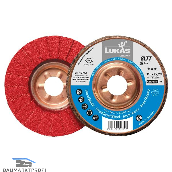 Der Turboteller von Lukas. Gerade Ausführung. Außergewöhnliche Zerspanungsleistung durch neuartige patentierte Lamellenform und deren Anordnung. Innovatives Werkzeugdesign mit mehr als 70% des Schleifmaterials im Außenbereich der Trägerscheibe. Bis zu sechs Schleifschichten übereinander angeordnet.