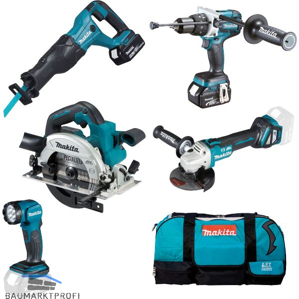 Lieferung inkl. 2 Akkus (Li-Ion) 5,0 Ah, Schnellladegerät DC 18 RC, Akku-Schlagbohrschrauber DHP 481 Z, Akku-Handkreissäge DHS 661 Z, Akku-Winkelschleifer DGA 513 Z, Akku-Reciprosäge DJR 186 Z, Akku-LED Lampe DML 815, Tiefenanschlag, Schutzhaube, Parallelanschlag, Reciprosägeblatt für Metall, Metallhaken, Seitengriff, Absaugstutzen, Reciprosägeblatt für Metall, Schraube M4x12, Haken, 6-kant Stiftschlüssel 5 mm, Bit-Halter, EFFICUT Handkreissägeblatt 165, Aufsteck-Schutzhaube (Trennen), Schnellspannbohrfutter 13 mm, Spannflansch, PH/Schlitz Doppelbit, Flanschmutter, Stirnlochschlüssel, Schruppscheibe, Transporttasche soft mit Rollen.