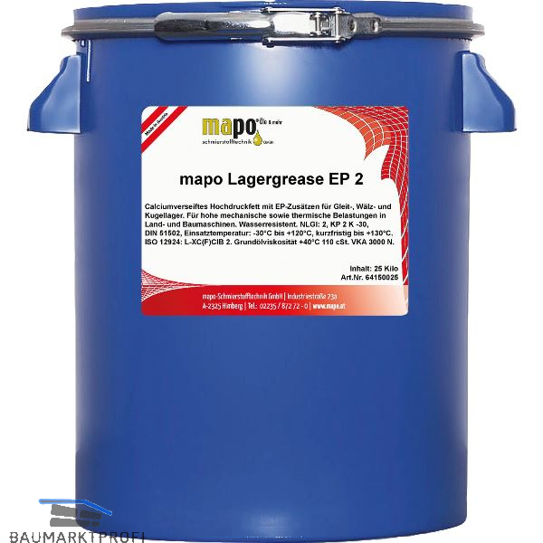 Mapo LagerGrease EP2 ist ein hochwertiges, calciumverseiftes Hochdruckfett (EP-Fett), das speziell für Gleit-, Wälz- und Kugellager entwickelt wurde. Es eignet sich besonders für hohe mechanische und thermische Belastungen, wie sie in Land- und Baumaschinen auftreten.