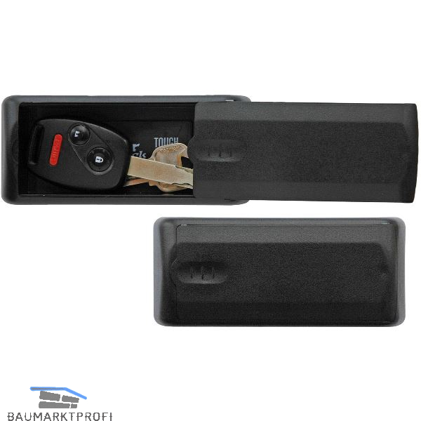 Magnetischer Schlüsselsafe mit Schiebedeckel, aus robustem, strapazierfähigem, schlagfestem Kunststoff. Passend für die meisten Schlüssel, auch mit Schlüsselanhänger. Der eingelassene Magnet hält sicher auf jeder Stahloberfläche.