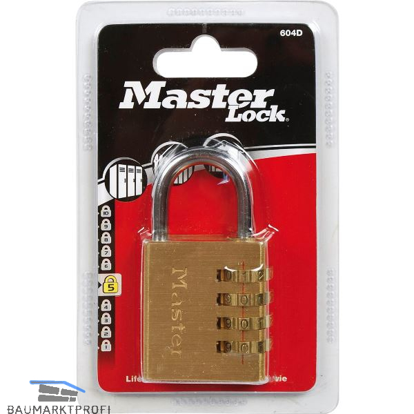 Zahlenschloss aus Aluminium mit Messing FinishBügel aus verchromtem Stahleinstellbare 4-stellige ZahlenkombinationZahlenrolle aus Messingje 1 Stk. in Blisterverpackung