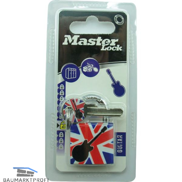 Vorhangschloss aus EisenBügel aus gehärtetem Stahl4 Stift ZylinderMotiv: Gitarreje 1 Stück in Blisterverpackung