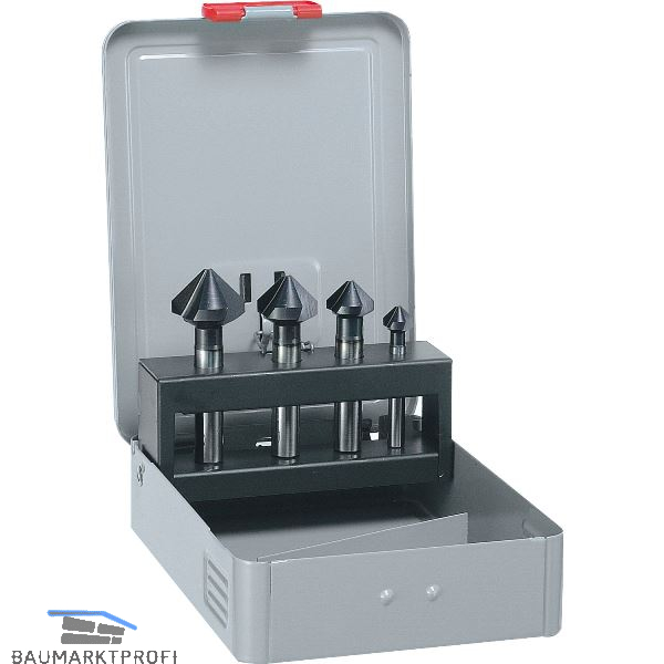 Bestückt mit Kegelsenkern HSS Co5 ALUNIT für alle E- und NE-Metalle, Kunststoffe hart und weich. Für VA- und rostfreie Stähle. Sehr gute Schneideigenschaften durch ungleichgeteilte Schneiden. In Metallkassette.