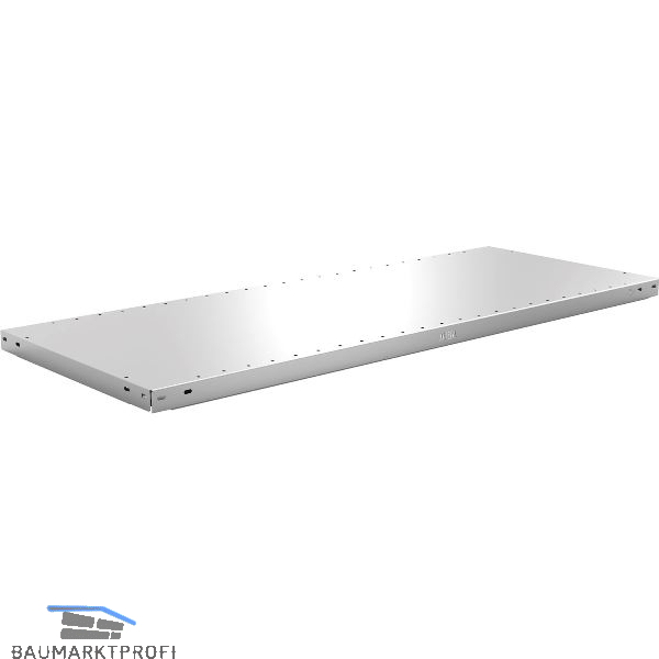 Regalboden MS150-III verzinkt. Bodenabkantung 40 mm, ohne Fachbodenträger. Mit Systemlochung im 50 mm Raster. Geschlossene Ecke und Zugstrebe, offene C-Kanten in Tiefenrichtung, geschlossener Längskanal. Passend zu Schraub- und Steckregal.