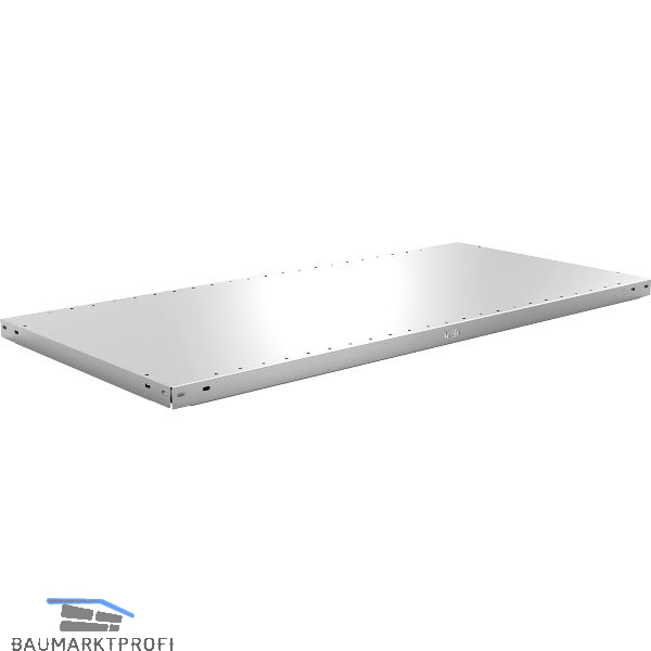 Regalboden MS150-III verzinkt. Bodenabkantung 40 mm, ohne Fachbodenträger. Mit Systemlochung im 50 mm Raster. Geschlossene Ecke und Zugstrebe, offene C-Kanten in Tiefenrichtung, geschlossener Längskanal. Passend zu Schraub- und Steckregal.