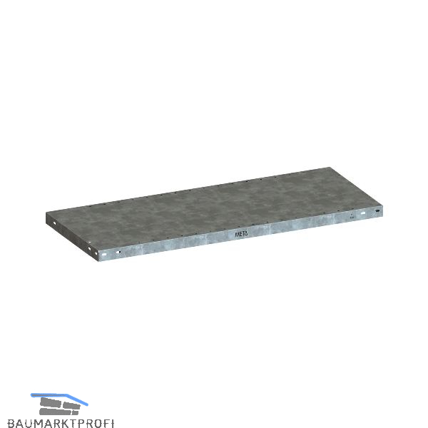 Regalboden MS150 verzinkt. Bodenabkantung 40 mm, ohne Fachbodenträger. Mit Systemlochung im 50 mm Raster. Geschlossene Ecke und Zugstrebe, offene C-Kanten in Tiefenrichtung, geschlossener Längskanal. Passend zu Schraub- und Steckregal.