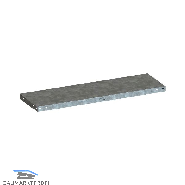 Regalboden MS verzinkt. Bodenabkantung 40 mm, ohne Fachbodenträger. Mit Systemlochung im 50 mm Raster. Geschlossene Ecke und Zugstrebe, offene C-Kante in Tiefenrichtung, geschlossener Längskanal. Passend zu Schraub- und Steckregal.