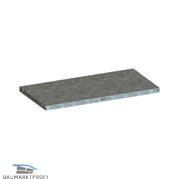 Fachboden verzinkt, Bodenabkantung 40 mm, ohne Fachbodenträger. Mit Systemlochung im 50 mm Raster. Geschlossene Ecken, geschlossener Längskanal, offene C-Kante in Tiefenrichtung. Passend zu Schraub- und Steckregal.