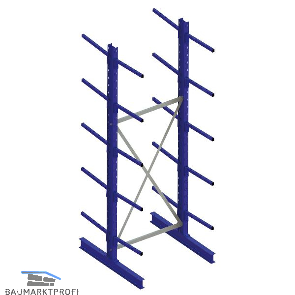 Regal für leichte Lastanforderungen, für liegende Langgutware, Lagerung von Tafel- und Plattenware. Kragarme im Raster von 100 mm verstellbar, stabile Qualität der Spitzenklasse. Perfekte Sicherheit. Aushebesicherung sichert zuverlässig die Kragarme gegen das unbeabsichtigte Ausheben bei der Ein- oder Auslagerung. Eingesteckte Kragarme mit Feststellschraube, jederzeit höhenverstellbar und nachträglicher Umbau möglich. Achsmaß 1030 mm. Farbe RAL 5010 enzianblau, inkl. Tragkraftschilder.