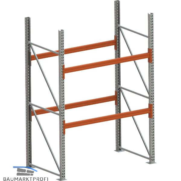 Modernes, ausgereiftes Palettenregalsystem für die Lagerung von leichten bis mittelschweren Paletten oder Stückgut, Längs- oder Quereinlagerung, möglich 4-Haken-Agraffe im 50 mm Raster höhenverstellbar, geschlossene Kastenprofile garantieren eine hohe Stabilität, Ständer bestehen aus kaltverformten Profilen, die bauseits mit der Ausfachung verschraubt werden.