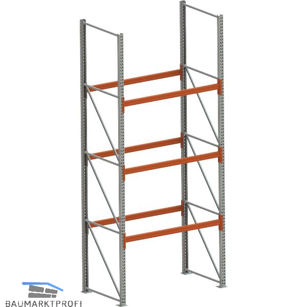 Modernes, ausgereiftes Palettenregalsystem für die Lagerung von leichten bis mittelschweren Paletten oder Stückgut, Längs- oder Quereinlagerung, möglich 4-Haken-Agraffe im 50 mm Raster höhenverstellbar, geschlossene Kastenprofile garantieren eine hohe Stabilität, Ständer bestehen aus kaltverformten Profilen, die bauseits mit der Ausfachung verschraubt werden.