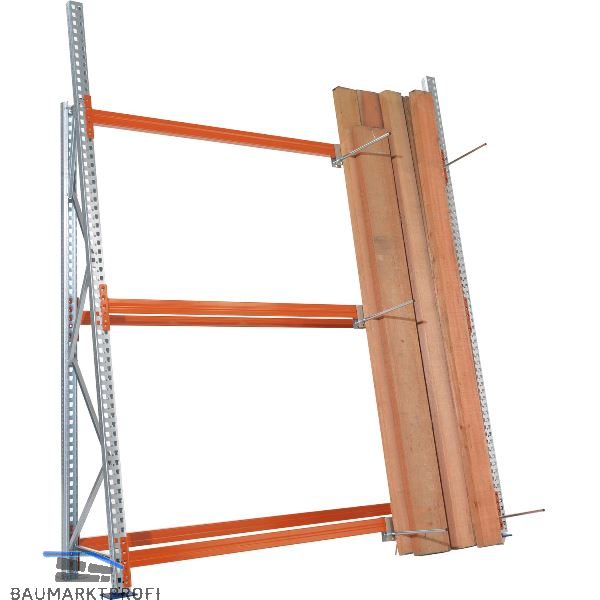 Profillagerregal Multipal. Anbaufeld einseitig. RAL 2001 rotorange. Geeignet für die stehende Lagerung von schweren Profilhölzern, Leisten, Paneelen, Stabmaterial. Neigung der Ständerrahmen 10º seitlich anlegende Last max. 200 kg, Vertikallast max. 1135 kg. pro Feld.