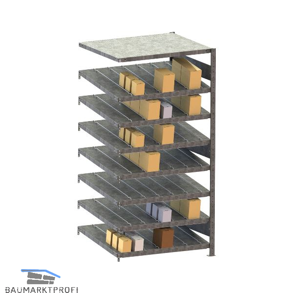 Einseitiges Schrägbodenregal besonders geeignet für Kartonware. Lagerware gleitet selbstständig zur Entnahmeseite hin. Schrägstellung: 14º. Erreicht besonders hohe Stabilität und Traglast, Fachlast 200 kg je Ebene. Schnelle Steckmontage ohne Werkzeug. Fachböden im Raster von 25 mm höhenverstellbar.