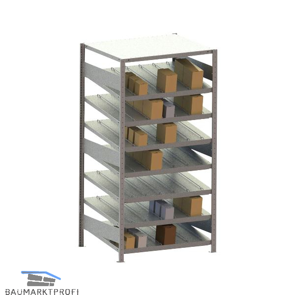 Einseitiges Schrägbodenregal besonders geeignet für Kartonware. Lagerware gleitet selbstständig zur Entnahmeseite hin. Schrägstellung: 14º. Erreicht besonders hohe Stabilität und Traglast, Fachlast 200 kg je Ebene. Schnelle Steckmontage ohne Werkzeug. Fachböden im Raster von 25 mm höhenverstellbar.