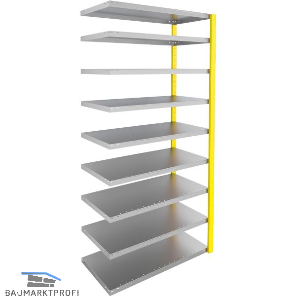 Die Rahmen werden aus bandverzinktem Qualitätsstahlblech gefertigt. RAL 1003 signalgelb pulverbeschichtet. Für die einfache und schnelle Steckmontage. Größen individuell anpassbar. Fachböden im Raster von 25 mm verstellbar für die variable Anpassung an das Lagergut.