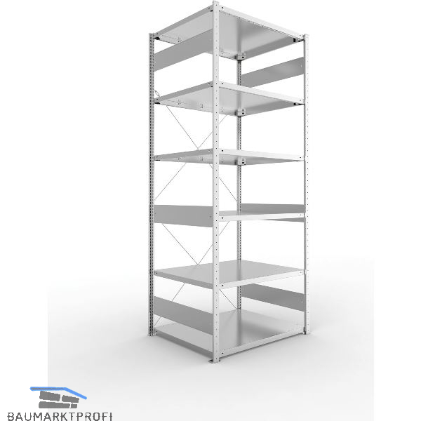 Die Rahmen werden aus bandverzinktem Qualitätsstahlblech gefertigt. Für die einfache und schnelle Steckmontage. Größen individuell anpassbar. Fachböden im Raster von 25 mm verstellbar für die variable Anpassung an das Lagergut.