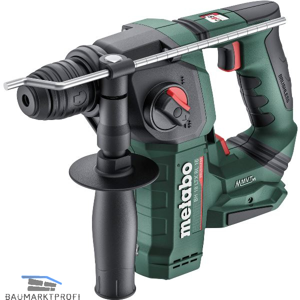 Sehr leichter, kompakter Akku-Hammer mit Brushless-Motor für ermüdungsarmes Bohren in jeder Arbeitsposition. Maximale Bohrleistung, Effizienz und Lebensdauer durch Brushless-Technologie und Hochleistungsschlagwerk. 2 Funktionen: Hammerbohren und Bohren. Metabo VibraTech (MVT): gesundheitsschonendes, ermüdungsarmes Arbeiten auch im Dauereinsatz. Vario-Tacho-Constamatic (VTC)-Vollwellenelektronik zum Arbeiten mit materialgerechten Drehzahlen, die unter Last konstant bleiben. Elektronische Sicherheitsabschaltung des Motors beim Blockieren des Einsatzwerkzeugs zum sicheren Arbeiten. LED-Arbeitslicht für optimale Sicht auf die Bohrstelle.