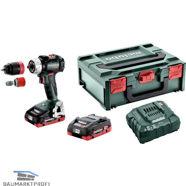 Lieferung inkl. 2 Akkus (Li-HD), Ladegerät ASC 55, 1,5-13 mm Schnellspannbohrfutter, Schnellwechselbithalter, Gürtelhaken und Bitdepot, in metaBOX 145.