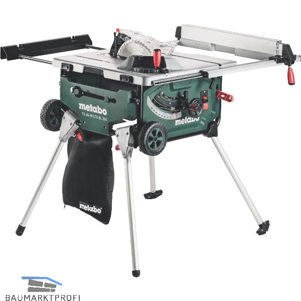 HM-Sägeblatt mit Wechselzahn Z40, Untergestell, Gummireifen, Parallelanschlag, Winkelanschlag, Tischverlängerung, Tischverbreiterung, Schiebestock, Staubzyklon, Textil-Staubsack, 4 Li-HD Akkupacks (18V/8,0 Ah), 2 Schnellladegeräte ASC Ultra "AIR COOLED", Fixiergurt für MetaLoc, MetaLoc Koffer
