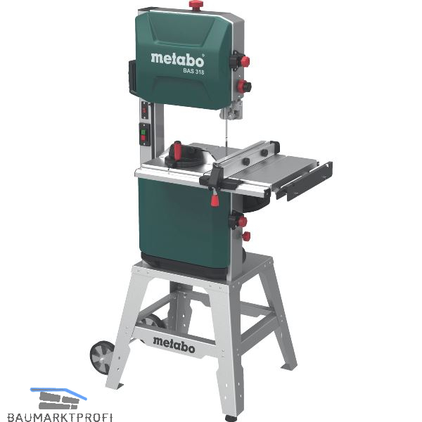 Universal-Bandsägeblatt A6, Untergestell, Parallelanschlag, Winkelanschlag, Absaugadapter (für Ø 44, 58, 100 mm), Staubfangbehälter, Schiebestock