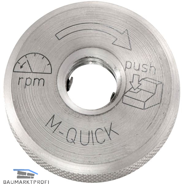 Speziell für Metabo Quick-System zum werkzeuglosen Scheibenwechsel auf Knopfdruck. Passend für alle kleinen Metabo Winkelschleifer mit M-Quick Spindelknopf, außer W 6-115, W 6-125, WB 11-125, erforderlicher Gewindeanschluss M 14.