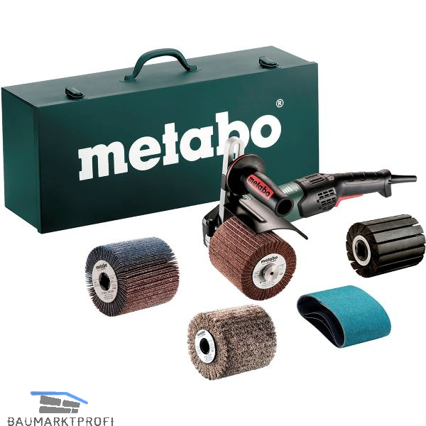 Lieferung inkl. Expansionswalze (ø 90 x 100 mm), 3 Schleifbänder P 80 (ø 90 x 100 mm), Vliesrad P 280 (ø 105 x 100 mm), Lamellenschleifrad P 80 (ø 105 x 100 mm), Vliesrad mit Edelkorund-Schleifpapier P 180 (ø 105 x 100 mm), im Stahlblech-Tragkasten.