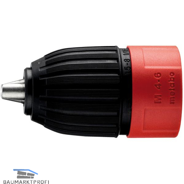Schnellspannbohrfutter zur Aufnahme von Gewindebohrern mit Vierkant und zylindrischen Bohrern. Einfacher, schneller und komfortabler Wechsel des Bohrfutters durch Metabo Schnellwechselsystem "Quick". Ausführung mit Kunststoffhülse, 1-hülsig, nicht schlagbohrfest, für Rechts- und Linkslauf geeignet. Bohrfutter mit Vierkantaufnahme 3,5 mm für M4, 5 mm für M6, 6 mm für M8 und 8,1 mm für M10 und M12. Passend für alle Metabo "Quick" Maschinen.