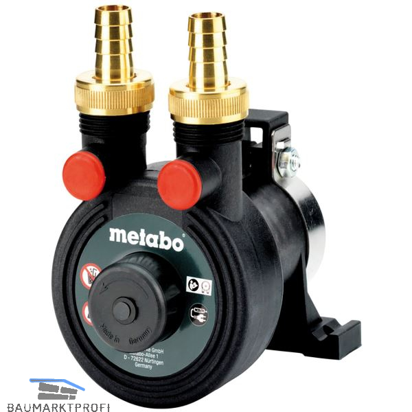 Selbstansaugend. Geeignet für Antriebsmaschinen mit Drehzahl bis 3400 U/min. Mit Metabo Schnellkupplung. Wassertemperatur max. 50º C. Größte Saughöhe 4 m, Anschlussstutzen für Schlauch R 3/4".