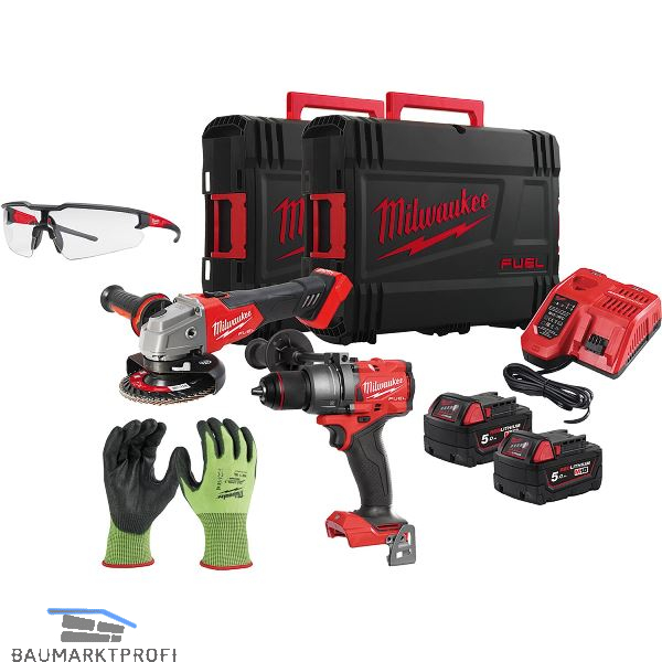 Lieferung inkl. 2 x Akku M 18 B5 5,0 Ah, Schnellladegerät M 12-18 FC, Akku-Schlagbohrschrauber M18 FPD3-0X, Akku-Winkelschleifer M18 FSAG125X-0, Schutzbrille, Schutzhandschuh, 2 x HD-Box.