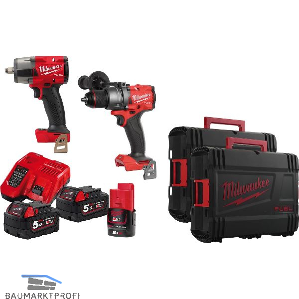 Lieferung inkl. 2 x Akku M 18 B5 5,0 Ah, 1 x Akku M 12 B2 2,0 Ah, Schnellladegerät M 12-18 FC, Akku-Schlagbohrschrauber M18 FPD3-0X, Akku-Schlagschrauber M18 FMTIW2F12, 2 x HD-Box
