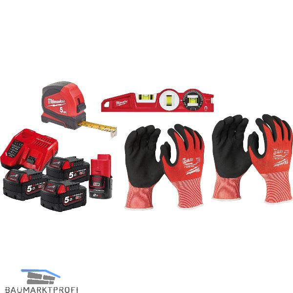 Lieferung inkl. 3 x 18 Volt / 5,0 Ah Li-Ion Schiebeakkus, 1 x 12 Volt / 2,0 Ah Li-Ion Steckakku und Ladegerät M12-18 FC, Rollbandmaß 5m, Wasserwaage 360°, Handschuh Größe 9, Handschuh Größe 10.