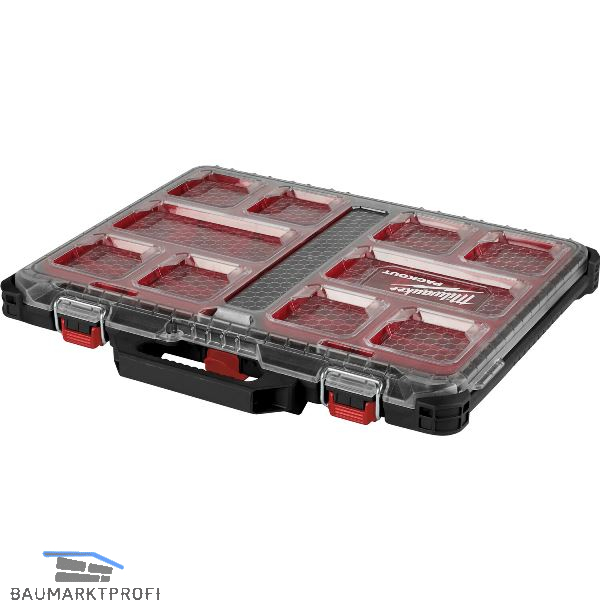 Aus dem modularen Aufbewahrungssystem PACKOUT™. Konstruktion aus stoßfesten Polymeren - ideal für den Baustelleneinsatz. Beinhaltet 2 große und 8 kleine Sortierboxen. Alle Sortierboxen beinhalten Einteiler. Transparenter Deckel sichert alle Sortierboxen im geschlossenen Zustand. IP65 Schutzklasse schützt vor Staub, Wasser und Schmutz.
