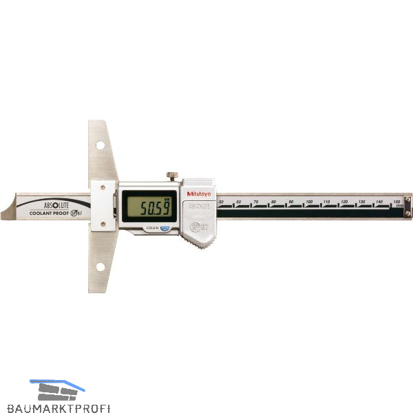 Elektronischer Tiefenmessschieber nach Schutzart IP 67. Hervorragende Widerstandsfähigkeit für den Einsatz in besonders rauer Arbeitsumgebung. Er ist staubdicht und übersteht auch das zeitweilige komplette Untertauchen in Wasser, ohne Schaden zu nehmen. Mit eingebautem absolutem Maßstab. Einmalige Einstellung der Nullposition, die dann bis zum nächsten Batteriewechsel der absolute Nullpunkt bleibt. Mühelose Ablesung durch große LCD Displayziffern. Feststellschraube.