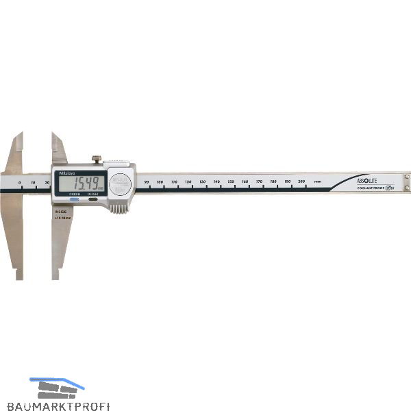Absolute Digimatic Messschieber mit schneidenförmigen Messflächen zur Aussenmessung und mit gerundeten Messflächen zum Messen von Innenmaßen.