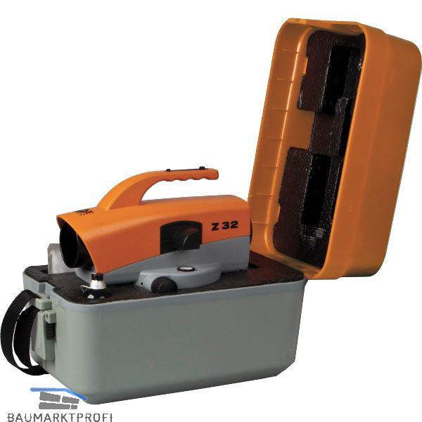 Automatisches Baunivellier mit 32-facher Vergrößerung. Lichtstarke Optik mit großem Objektivdurchmesser, Wasser- und staubgeschützt nach IPX6, robuster, zuverlässiger Kompensator mit Luftdämpfung. Kontrastreiches Bild, Prüfprotokoll. Stativgewinde 5/8".