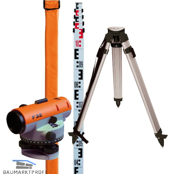 Lieferung inkl. 5 m Teleskoplatte und Hülle, Aluminium-Stativ, Senklot, Justiernadel, im Transportkoffer.