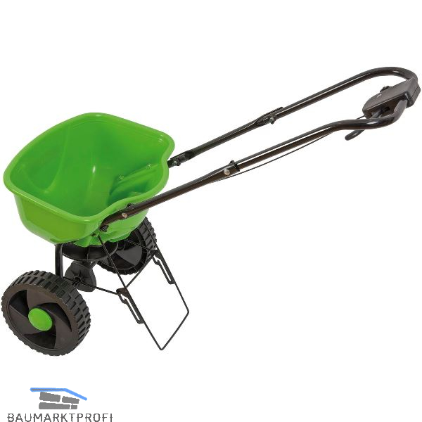 Der Streuwagen hat eine stufenlose Streuregulierung sowie einen Streustopp am Handgriff. Die Streuweite beträgt zwischen 2 und 3 Meter. Der Streutopf hat ein Fassungsvermögen von 15 Litern und kann Streugut mit einer Korngröße von 5 mm aufnehmen bzw. verteilen. Anwendungen: Split, Streusalz, Rasensamen, etc.