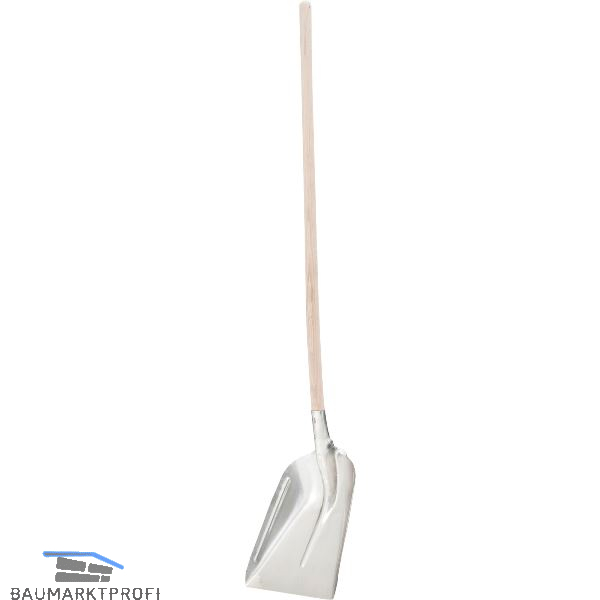 Universalschaufel mit gebogenem Hartholz-Stiel. Das aus gehärtetem Aluminium hergestellte Schaufelblatt ist rippenverstärkt und hat eine Arbeitsbreite von 33 cm.