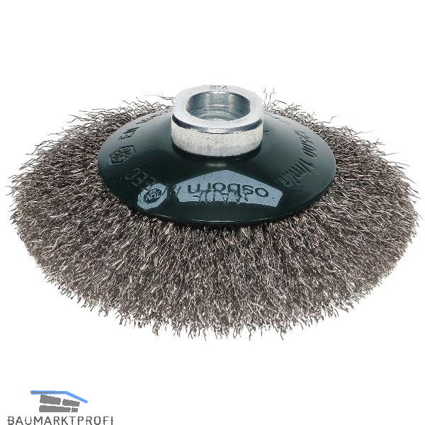 Gewellte Kegelbürste in Industriequalität zum Einsatz auf Winkelschleifern. Flexibles Besatzmaterial passt sich dem Werkstück optimal an. Kombiniert die besten Eigenschaften einer Topfbürste mit denen einer Rundbürste. Werkstücke mit großen Flächen und schwer zugänglichen Stellen können hiermit optimal bearbeitet werden. Zum Entrosten, Entlacken, Entgraten, Silikate.