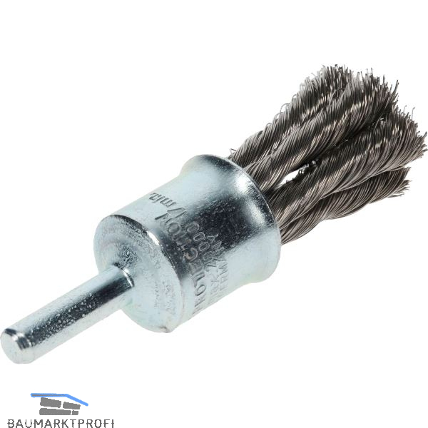 Gezopfte Pinselbürste in Industriequalität für den Einsatz auf schnelllaufenden Maschinen. Der Durchmesser der Bürste verändert sich mit zunehmender Arbeitsdrehzahl; die Bürste spreizt sich auf, so dass sich unterschiedliche Bohrungsdurchmesser bearbeiten lassen. Zum Entrosten, Entlacken, Entgraten, Schweißnähte.